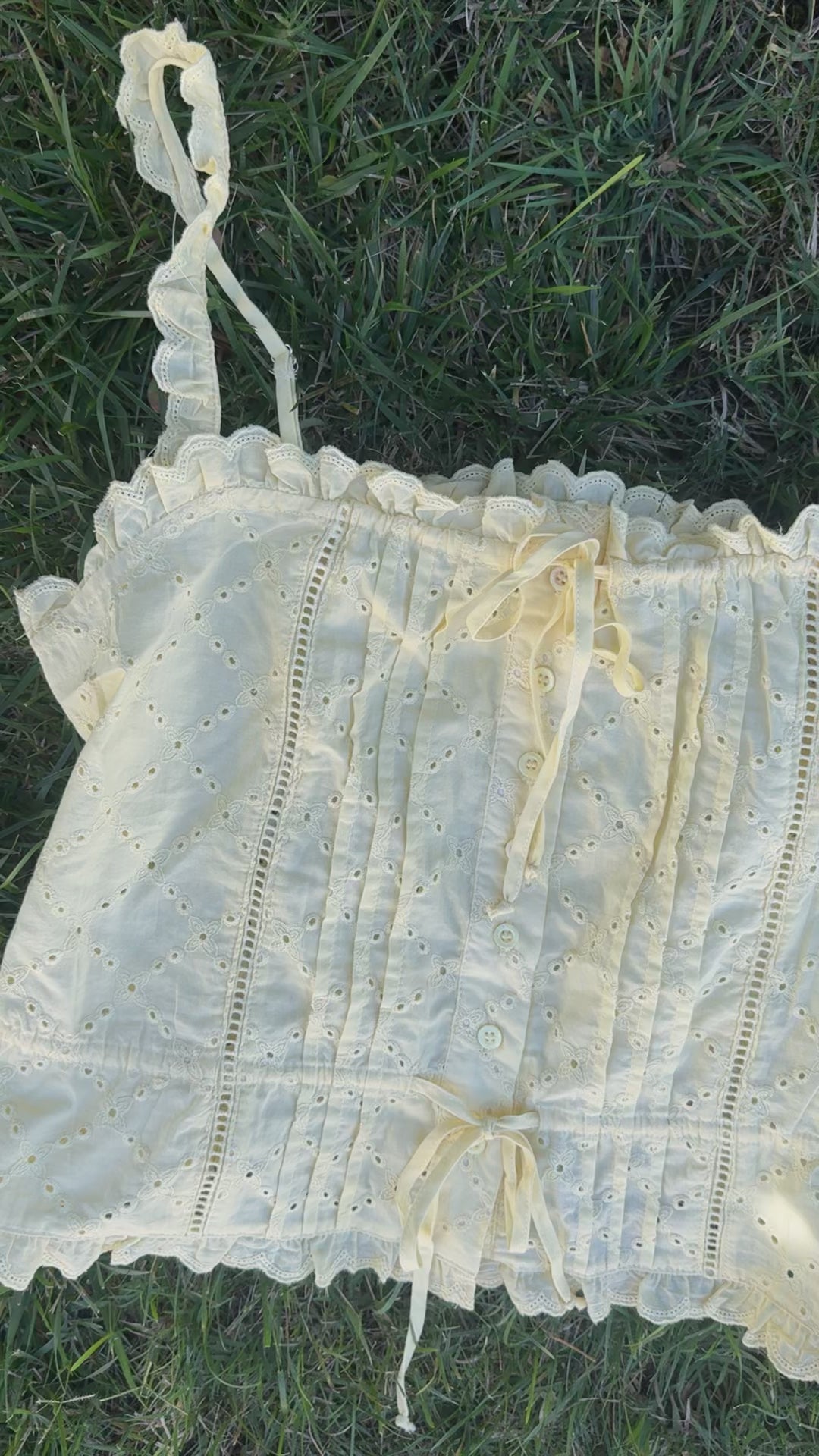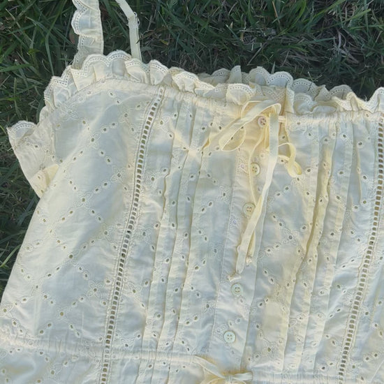 A feminine take on a classic silhouette, this woven cotton eyelet top features a square neckline, delicate trim details, and adjustable straps for the perfect fit. The button-down front is finished with a charming tie detail, making it an easy piece to dress up with trousers or down with denim.